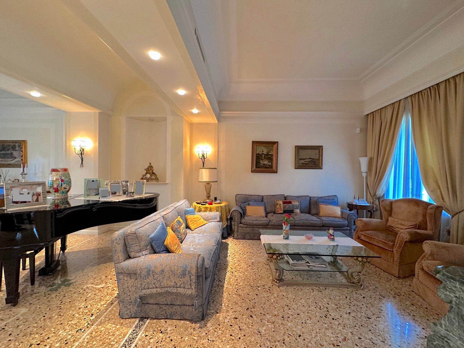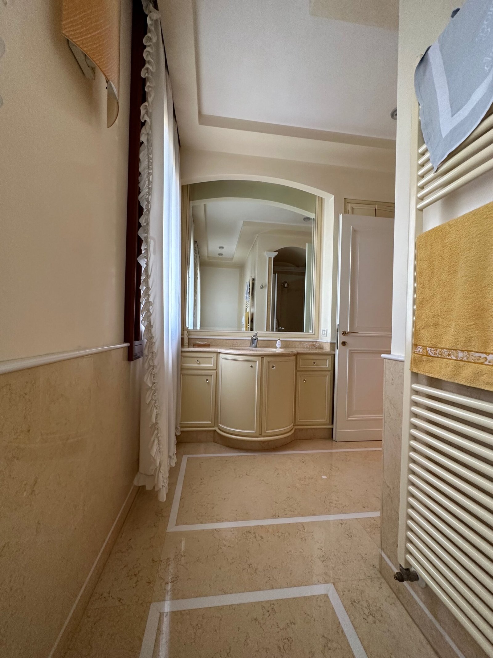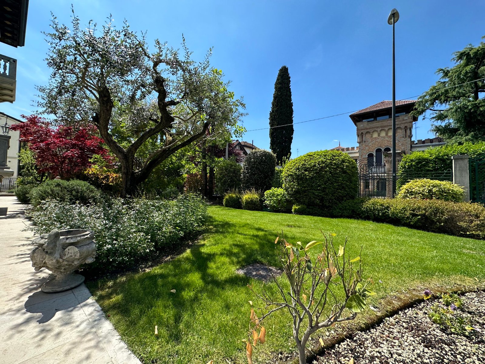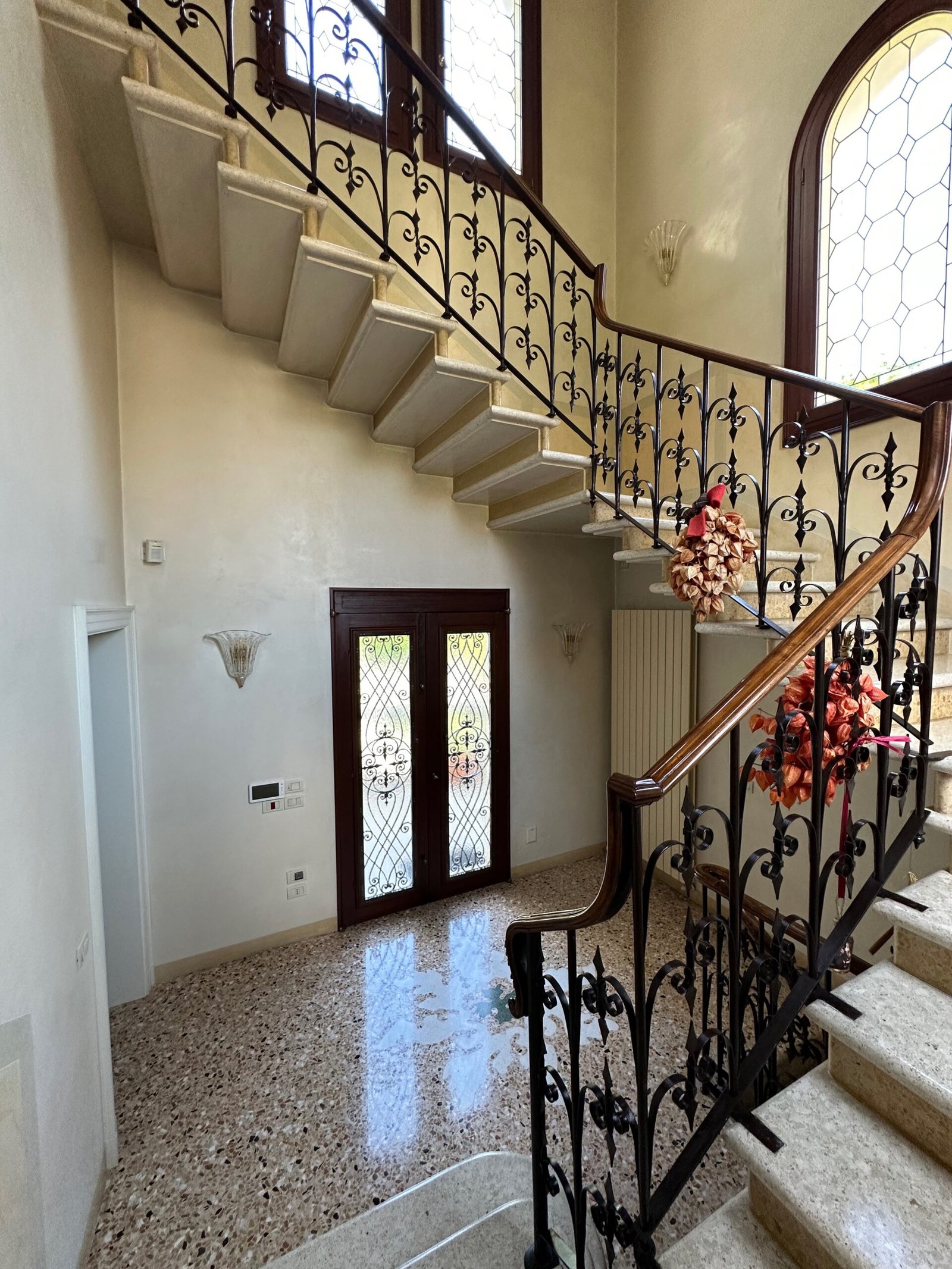 Questa proprietà incanta per il suo stile raffinato, il giardino piantumato e i materiali nobili delle finiture. Ad accentuarne l’eleganza, una morbida scala in pietra con balaustra ci accompagna verso l’ingresso.