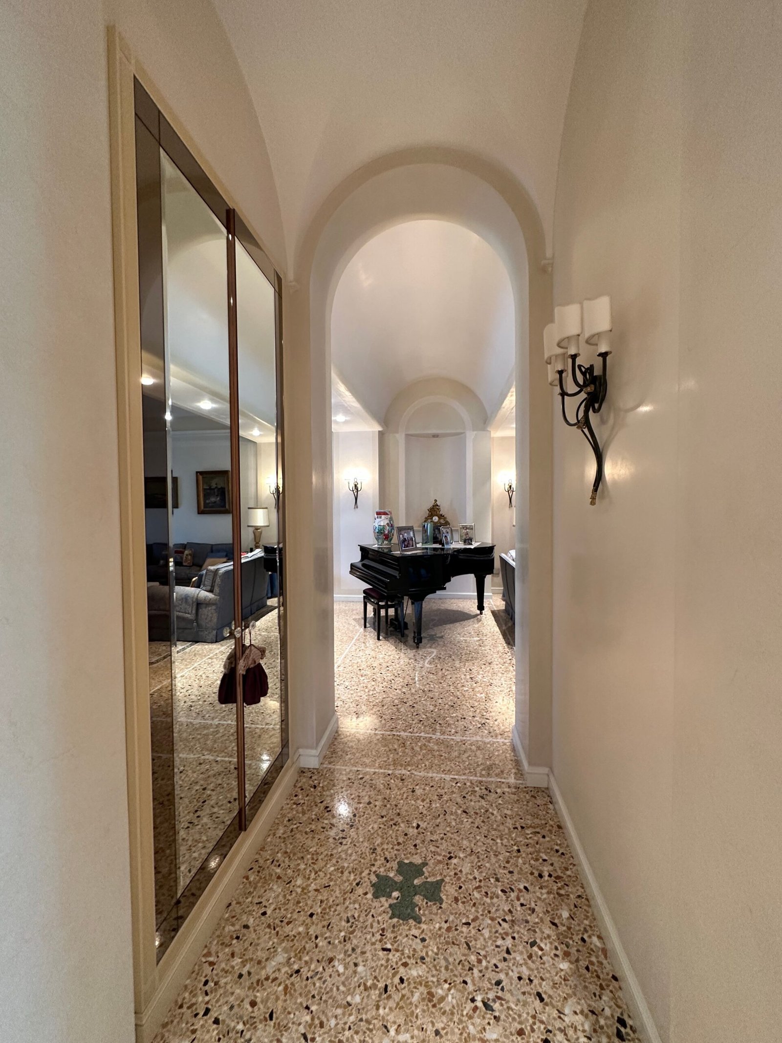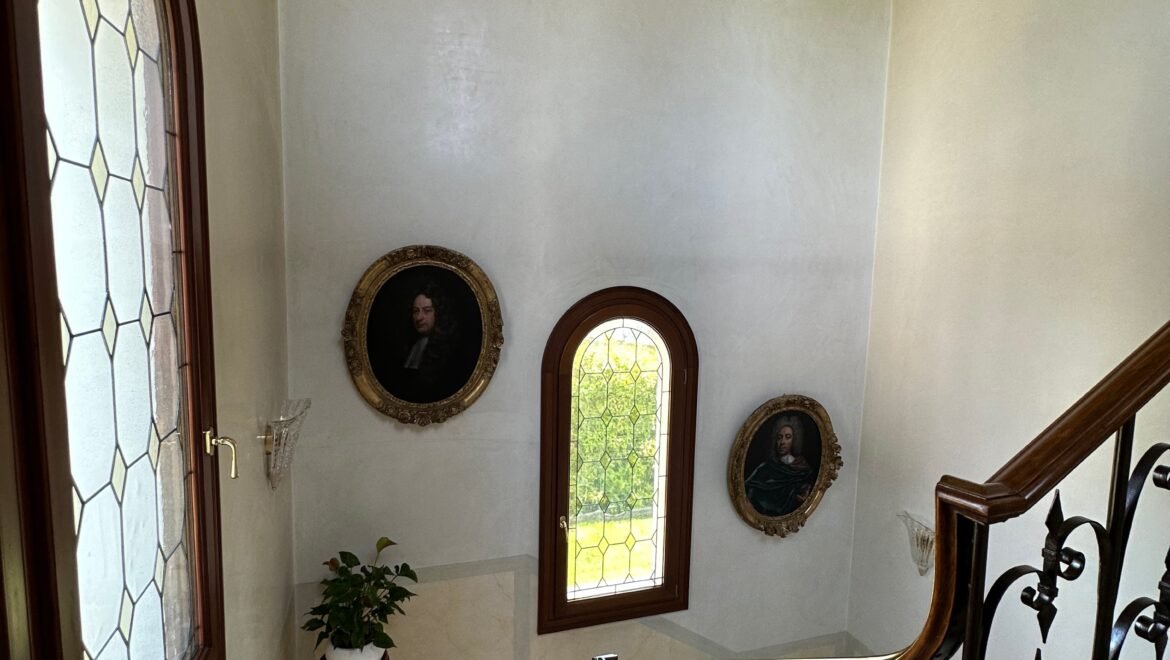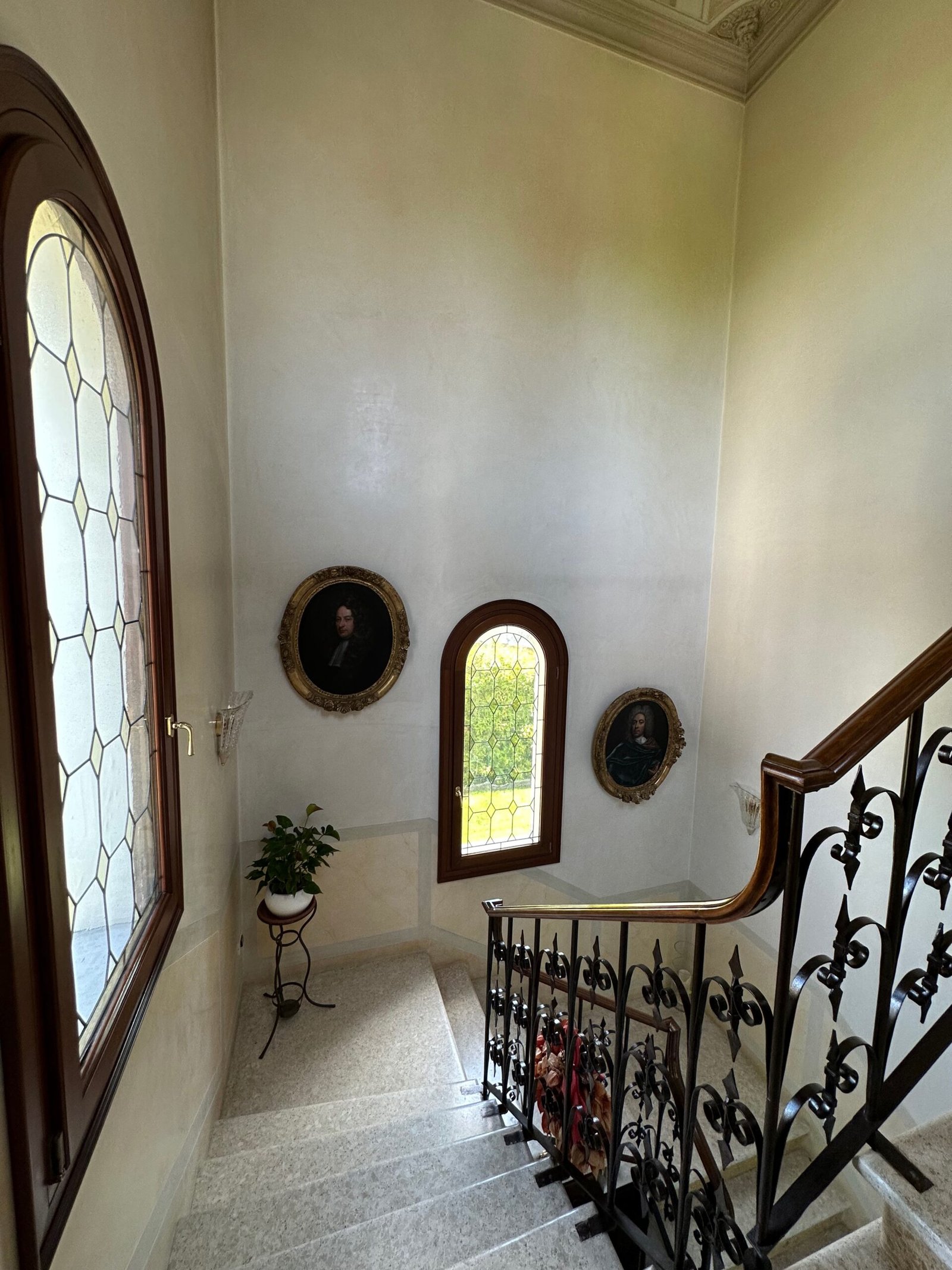 Ad accentuarne l’eleganza, una morbida scala in pietra con balaustra ci accompagna verso i portoni di ingresso.